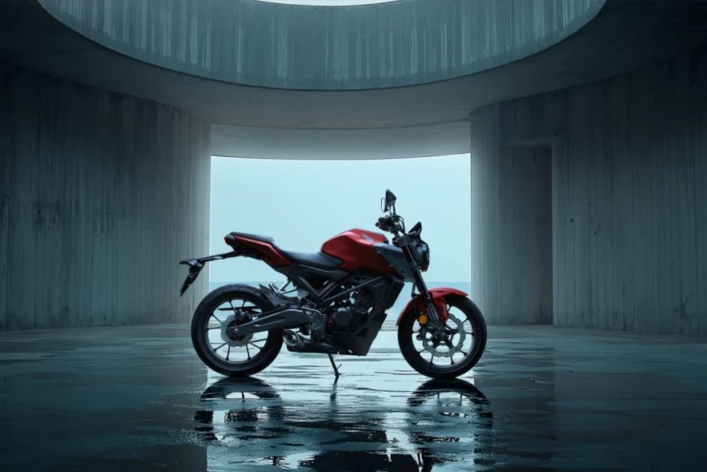 Ușor și bine echilibrat, CB125R se simte imediat agil, cu un centru de greutate coborât care îl face ideal atât în traficul urban, cât și pe drumuri sinuoase. Furca față Showa SFF-BP de 41 mm oferă reacții clare și stabilitate pe suprafețe variate, în timp ce frâna față cu disc de dimensiuni mari și etrier radial asigură o oprire sigură și progresivă. Experiența este completată de display-ul TFT color de 5”, care afișează informațiile esențiale într-un mod clar și elegant, integrat perfect în estetica Neo Sports Café.